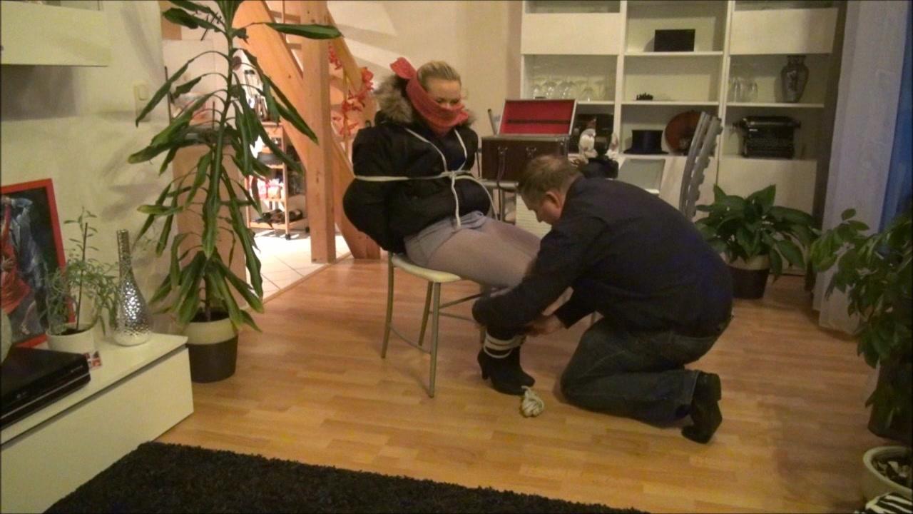 Jane is surprised by a burglar at home. He puts her out of action by shackles and gag. Helpless tied up in winter clothes Jane must watch as the stranger searches the house.